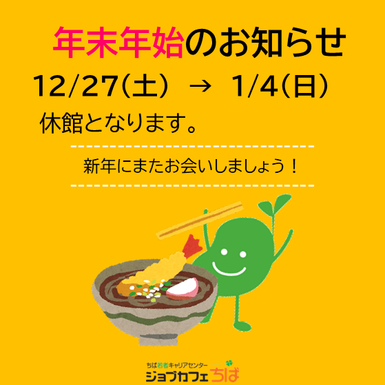 いつもジョブカフェちばをご利用いただきありがとうございます。 ジョブカフェちばは、年末年始下記の期間、休館いたします。