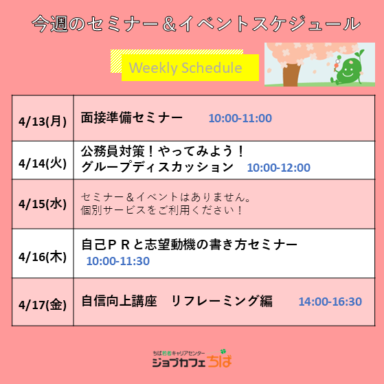 そして4月17日は、自信向上講座(リフレーミング編)。自分の短所やネガティブに感じている経験を、見方を変えて“強み”として捉え直す考え方を学びます。就活だけでなく、これからの社会人生活にも活かせる内容です。